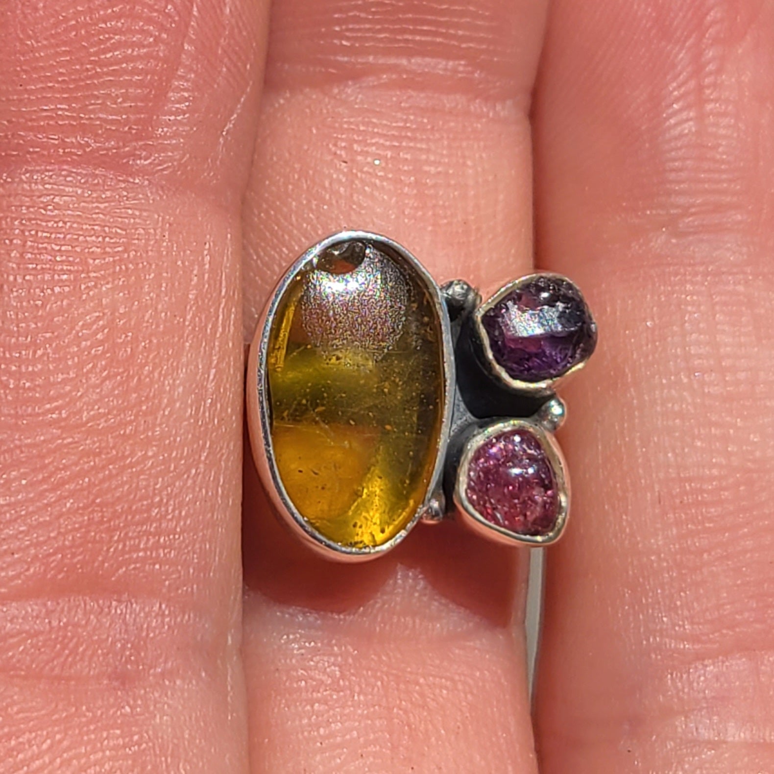 ~Baltic Amber, Amethyst (Rough) & Pink Tourmaline (Rough) 925 Ring~
