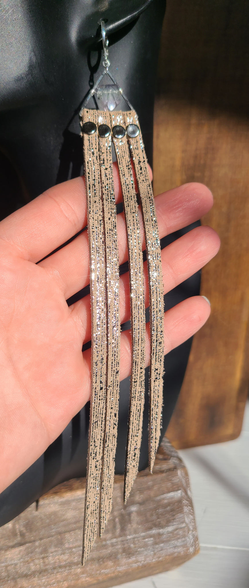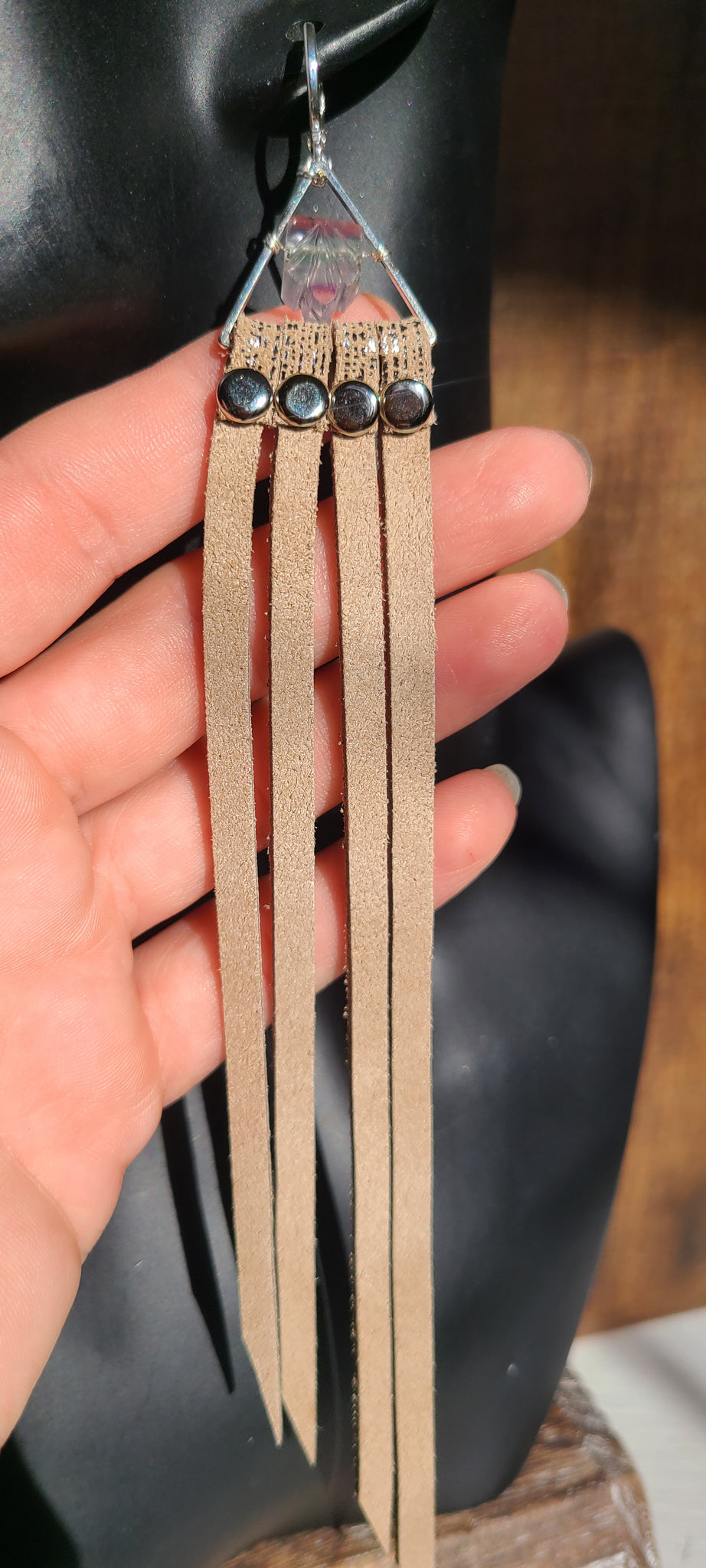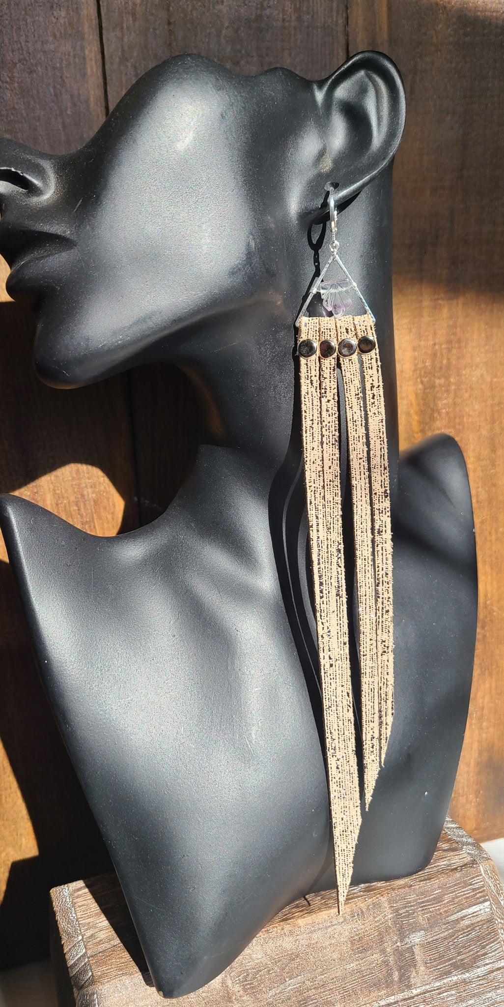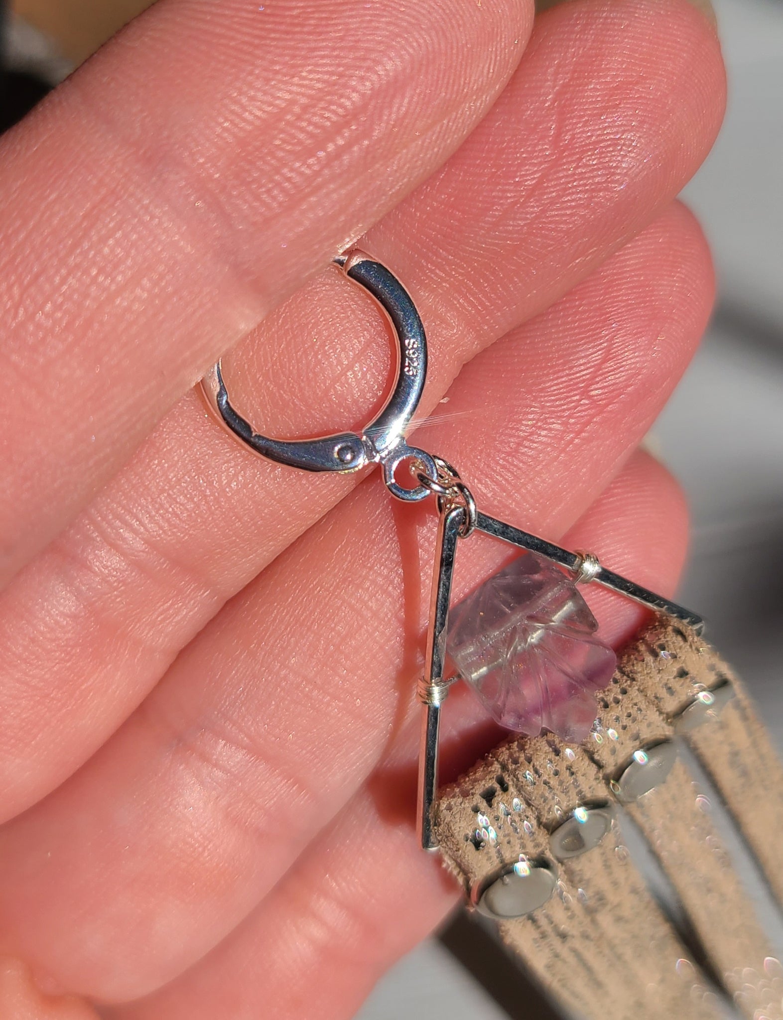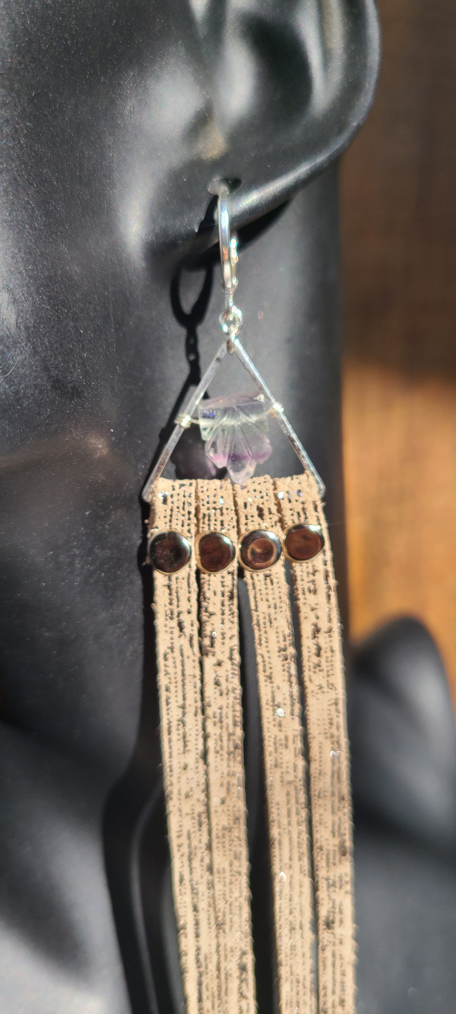 💫Handmade "Pyramid Love" series earrings made with hand cut shiny silver print on genuine tan cowhide leather attached with rivets, natural carved Fluorite stones wire wrapped to silver plated brass triangles, & solid 925 sterling silver leverback earring hooks💫