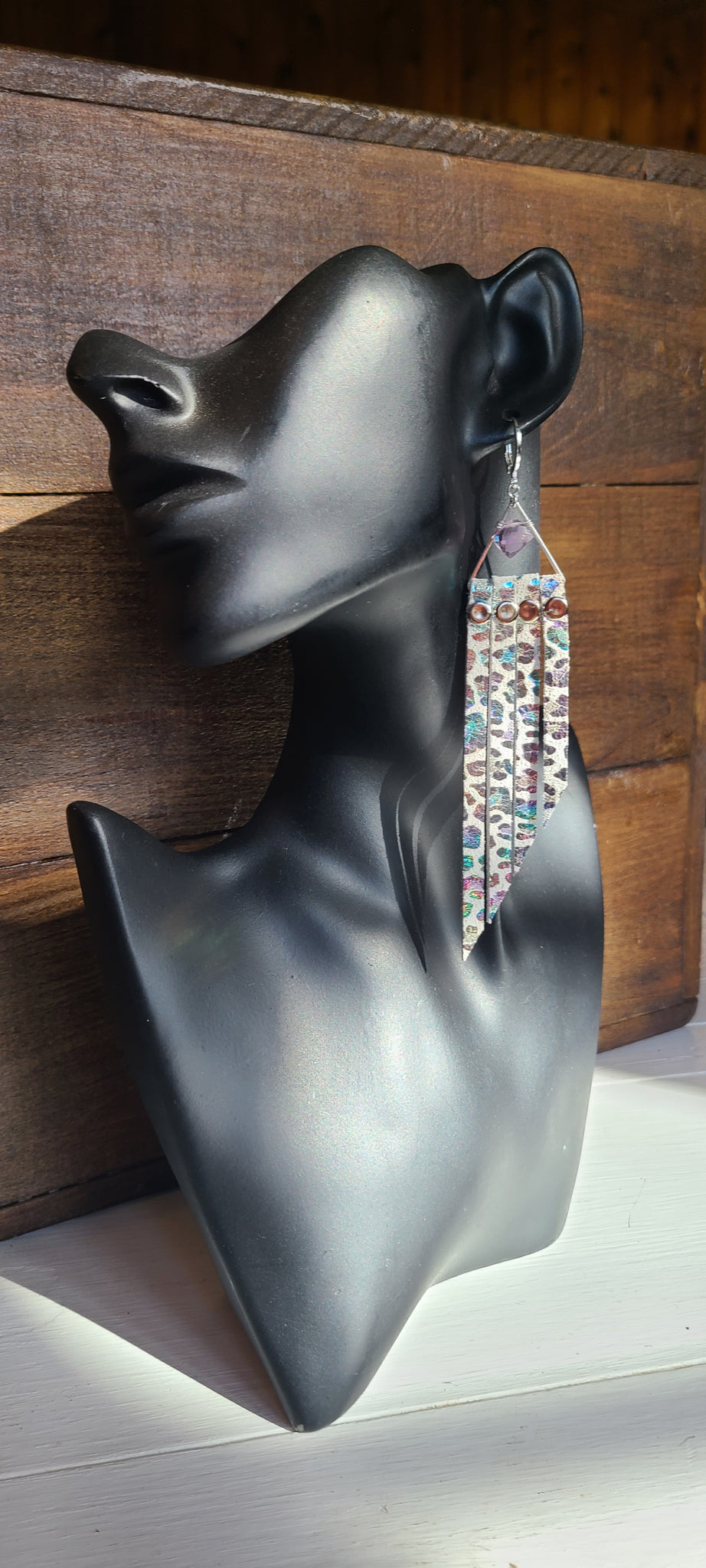 "Pyramid Love" Rainbow Irridescent Leopard Print Leather & Amethyst 925 Earrings