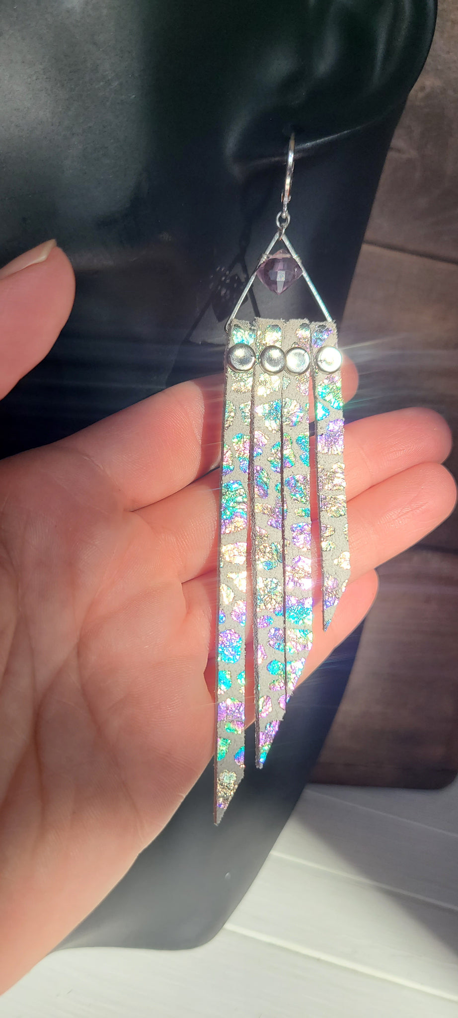 ~"Pyramid Love" Rainbow Irridescent Leopard Print Leather & Amethyst 925 Earrings~