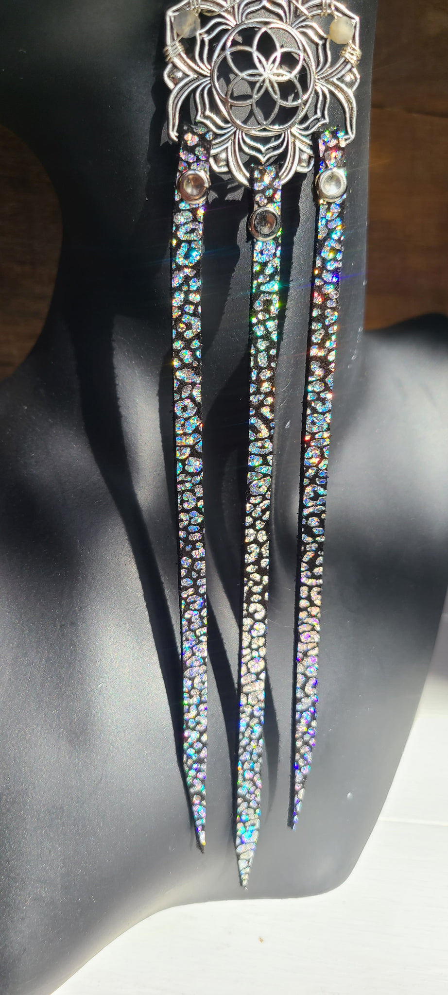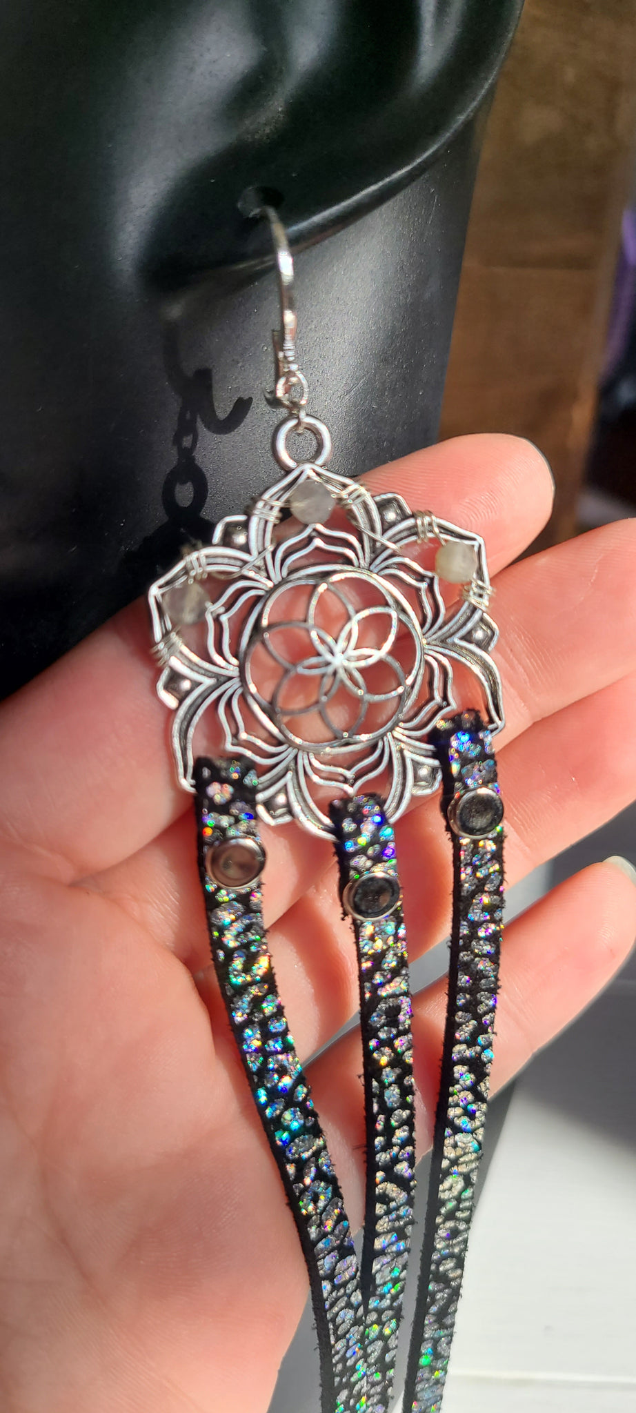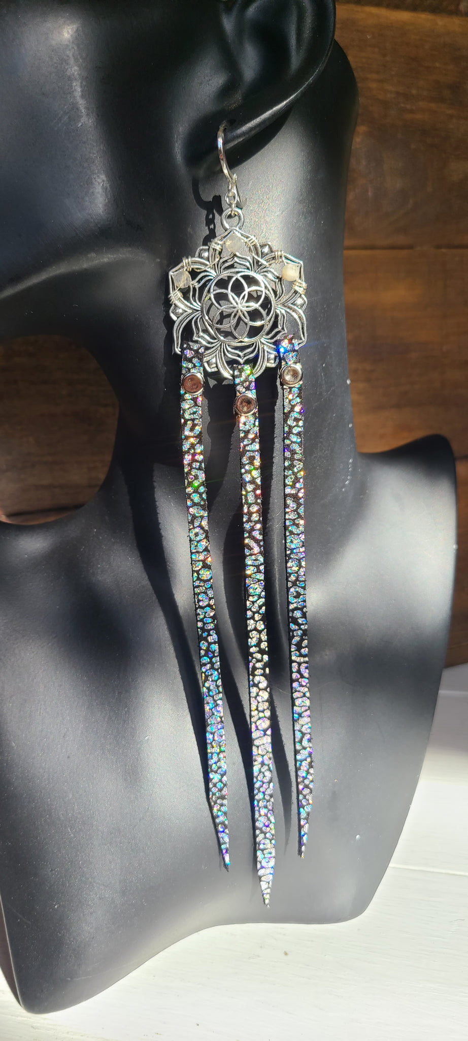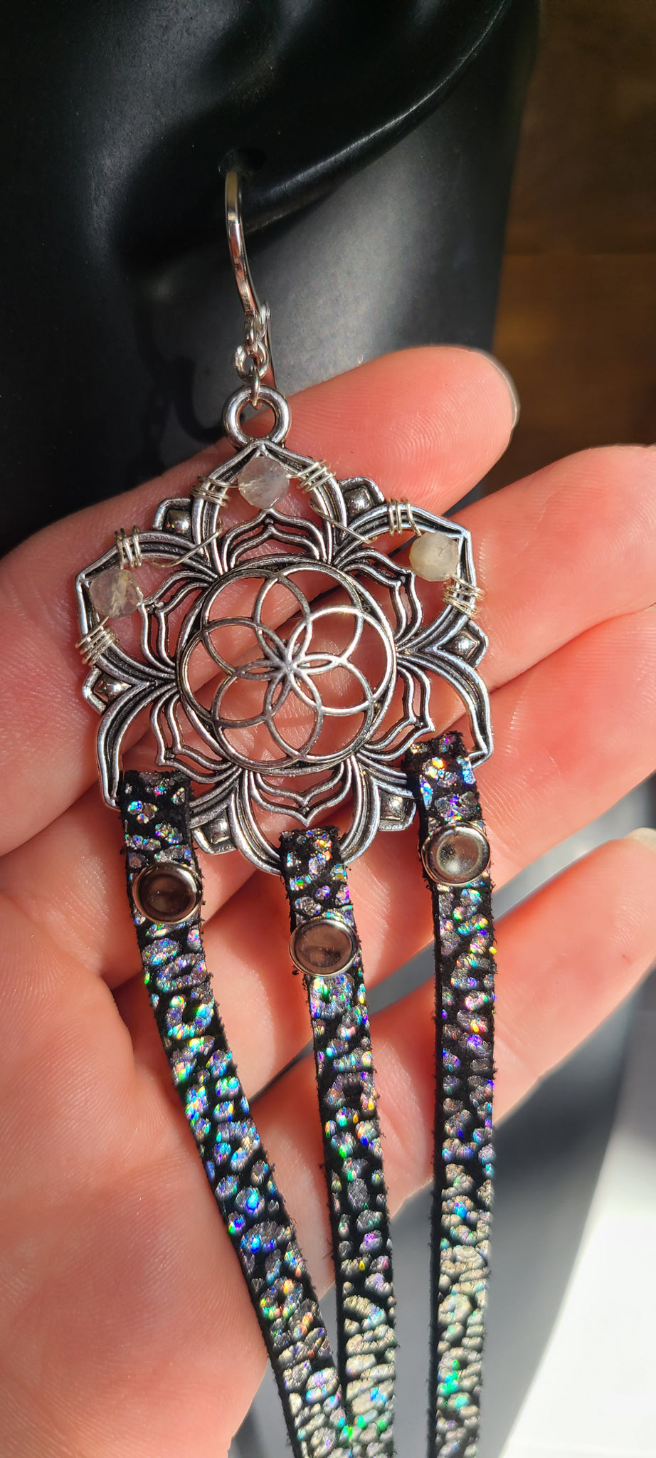 💫Handmade leather earrings made with hand cut iridescent leopard print on genuine black cowhide leather attached with rivets, natural tiny faceted Rainbow Moonstones wire wrapped to silver plated brass centerpieces, & solid 925 Sterling Silver leverback earring hooks💫