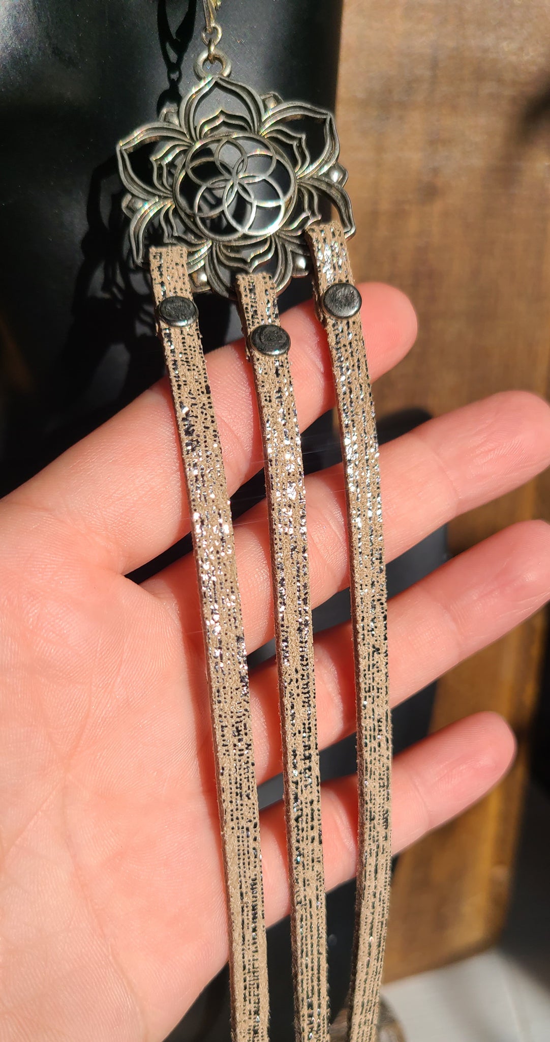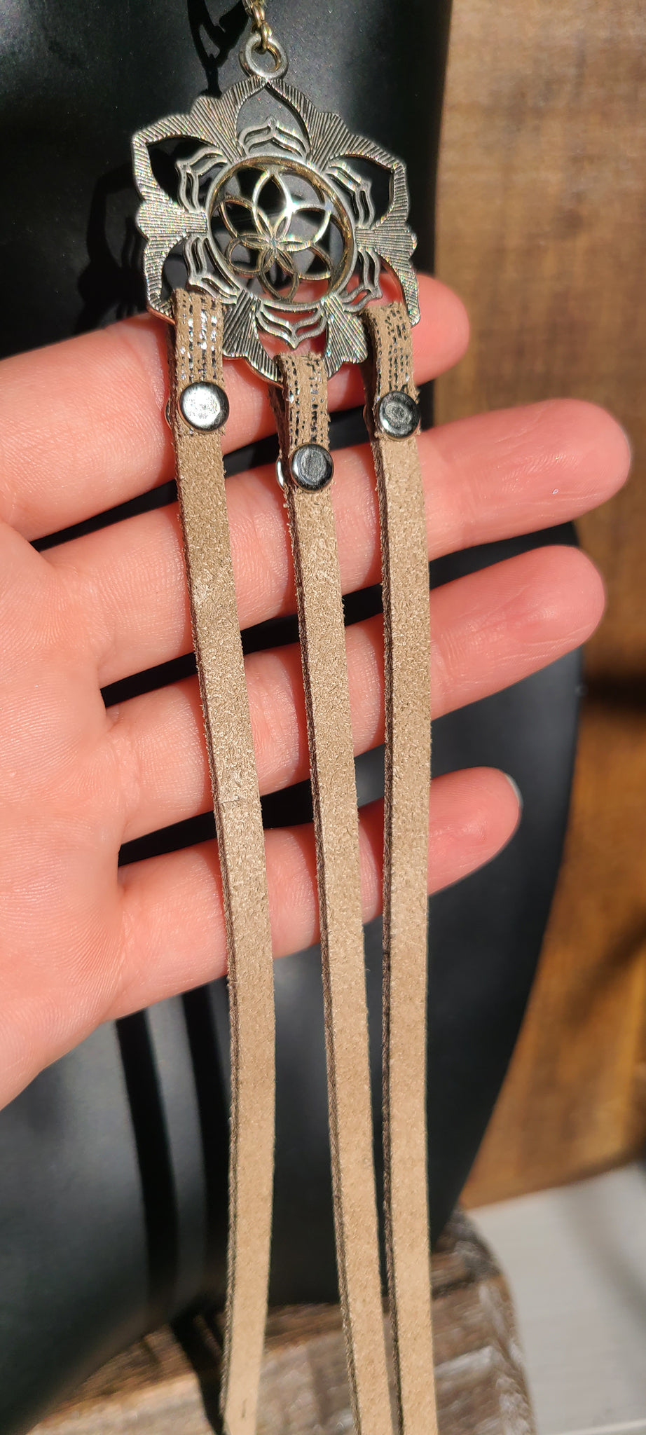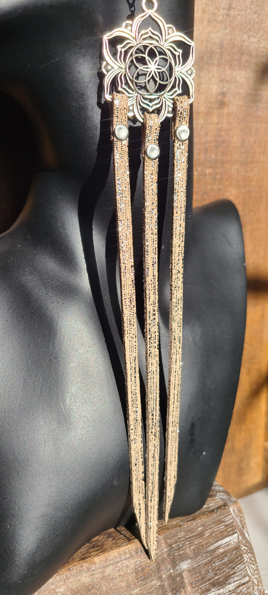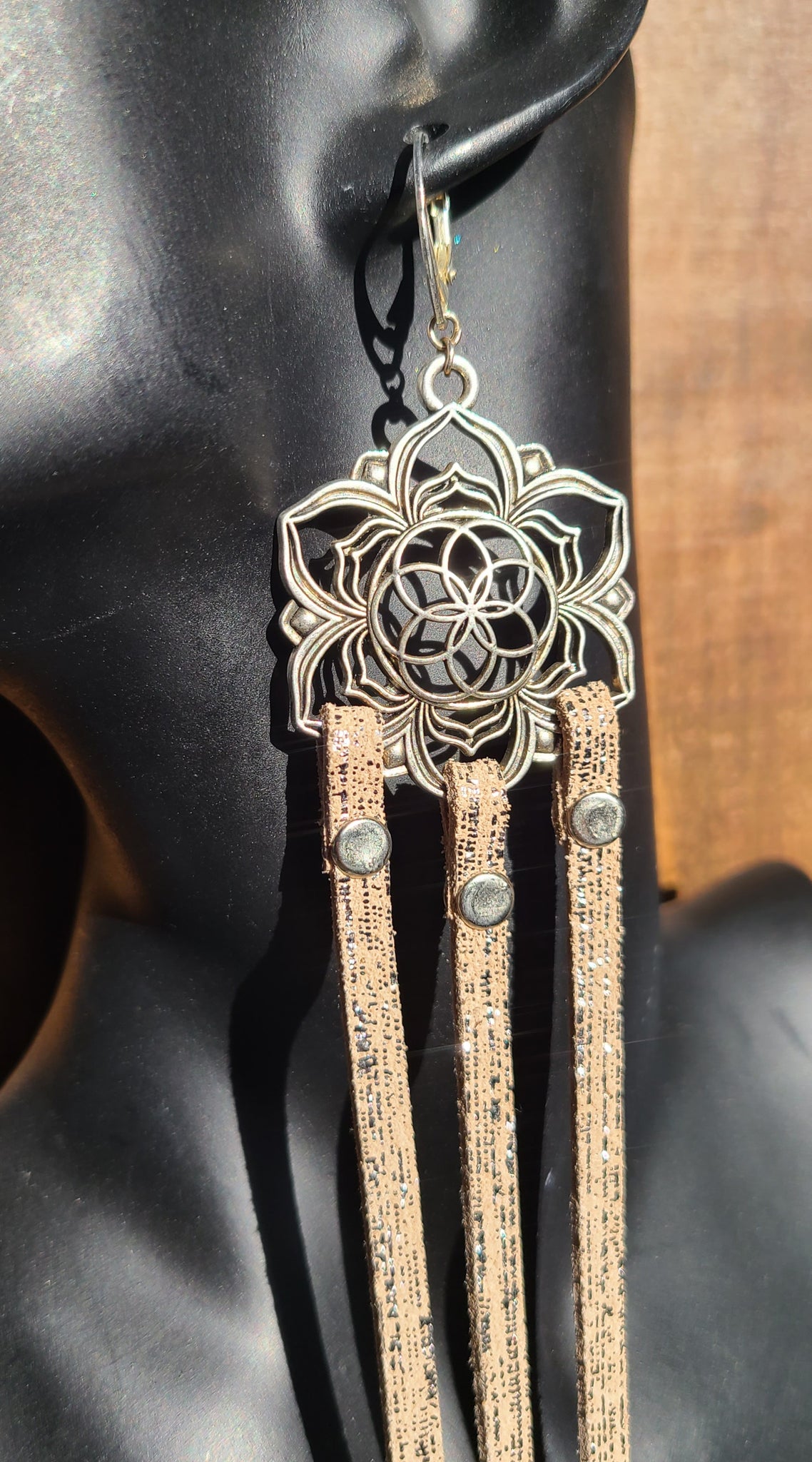 💫Handmade "Star Flower" leather earrings made with hand cut metallic silver drip print on tan leather attached with rivets to silver plated Star Flower centerpieces, & 925 Sterling Silver leverback earring hooks💫
