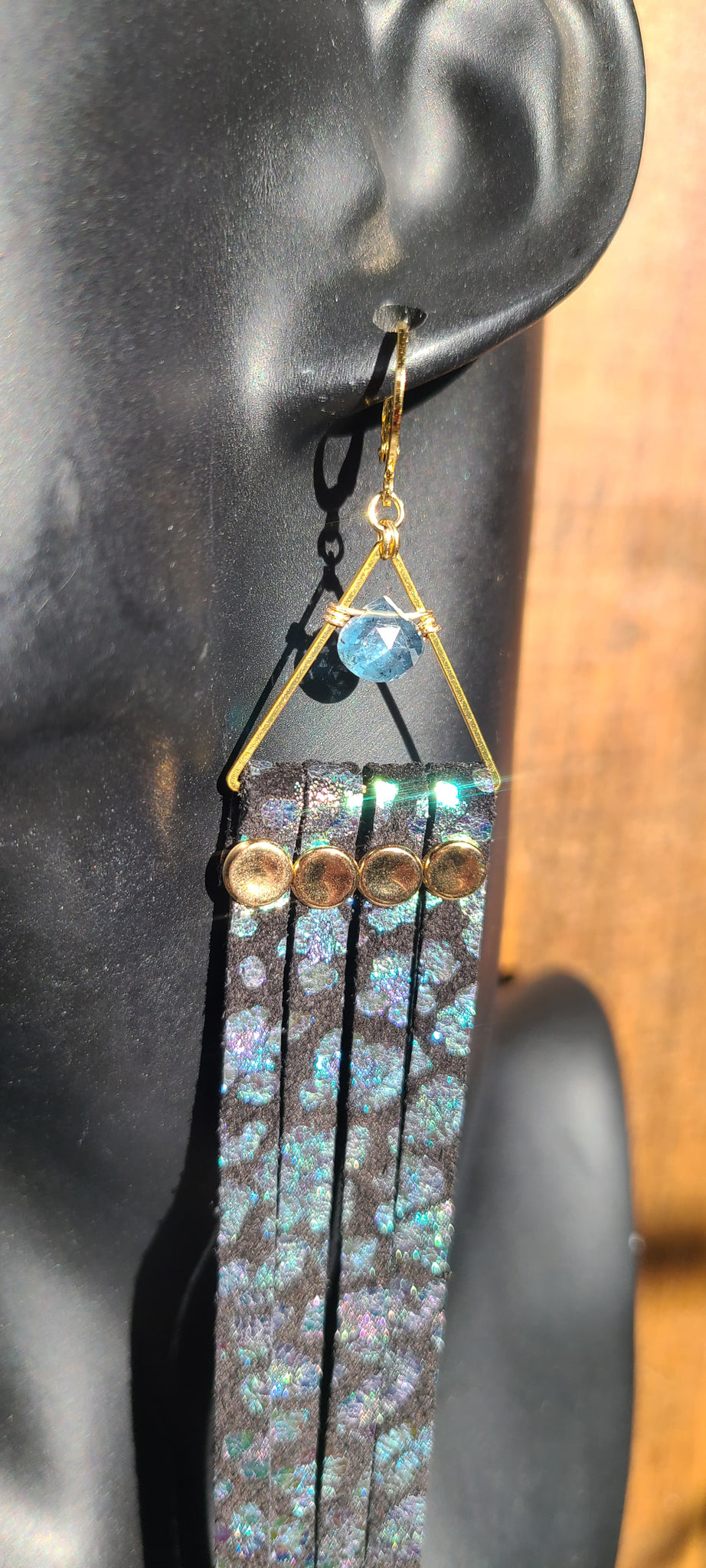 ~Handmade leather earrings with natural faceted Blue Topaz stones wire wrapped to gold plated brass triangles, hand cut rainbow iridescent leopard print on genuine black cowhide leather which I attached with gold rivets, & 14k gold plated Stainless Steel earring hooks~