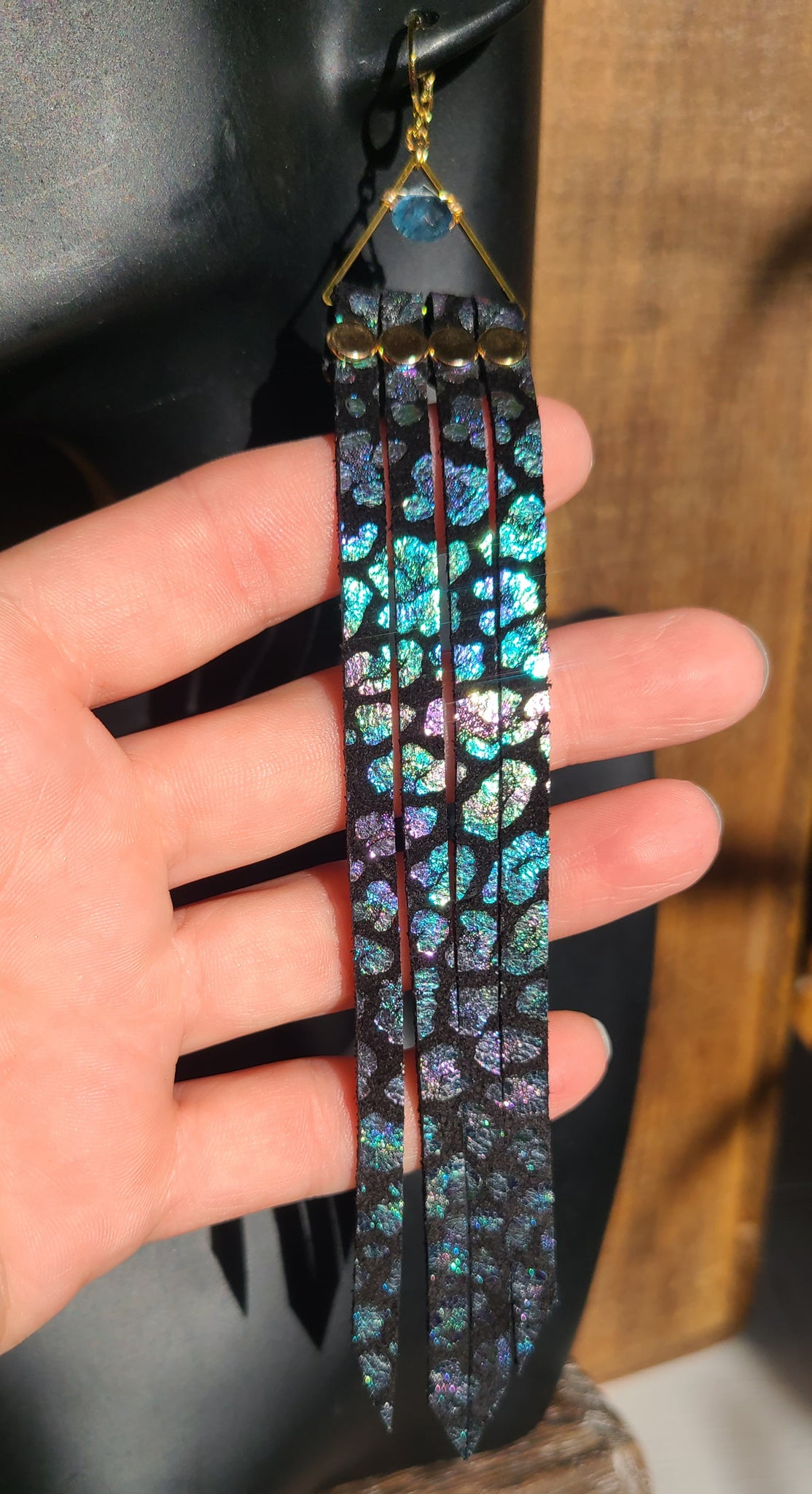 ~Blue Topaz & Rainbow Iridescent Leopard Print Black Leather 14k Gold Plated Earrings~